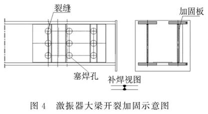 激振器大梁是设备强度高的部位,发生开裂的情况甚少,但现场条件各有不同,若有开裂,其加固方案和底梁类似,但其坡口深度与钢板厚度一致,焊接质量要求高,副板以16mm~20mm钢板为主,必要时副板上增加强筋。