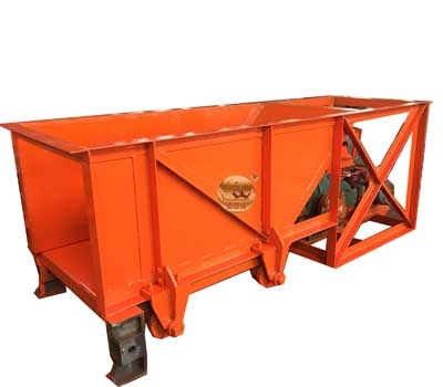 该机主要由以下几个主要部件组成,电动机、减速机、联轴器、偏心机构、漏板、槽架、滚轮等。该种设备一般安装在料仓出料口下部,矿石落入槽体底部的漏板上,底部漏板设置在滚轮上,并通过偏心机构使漏板与双出轴的减速机相连接,然后通过联轴器与电动机相接。工作时,由电动机通过联轴器带动减速机,并通过偏心盘与设备在槽架底部和滚轮之间的漏盘一起做往复直线运动,从而完成均匀给料。
