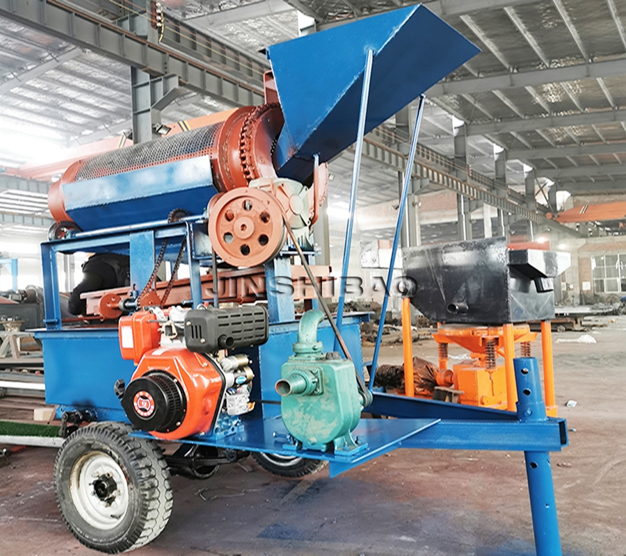 由于该设备通过柴油机来驱动,一台柴油机驱动滚筒筛,摇摆粘金毯,尾矿的固液分离系统,水泵等。当完成工作时可以通过